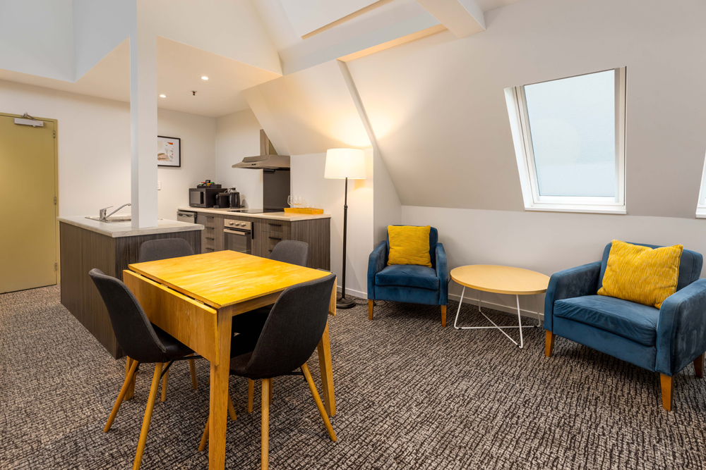 Each apartment has a lounge area with sofa bed, dining table and chairs, a fully equipped kitchen, tea/coffee making facilities, iron/ironing board and a smart television. Your bedside lamps also double as wireless device chargers.
