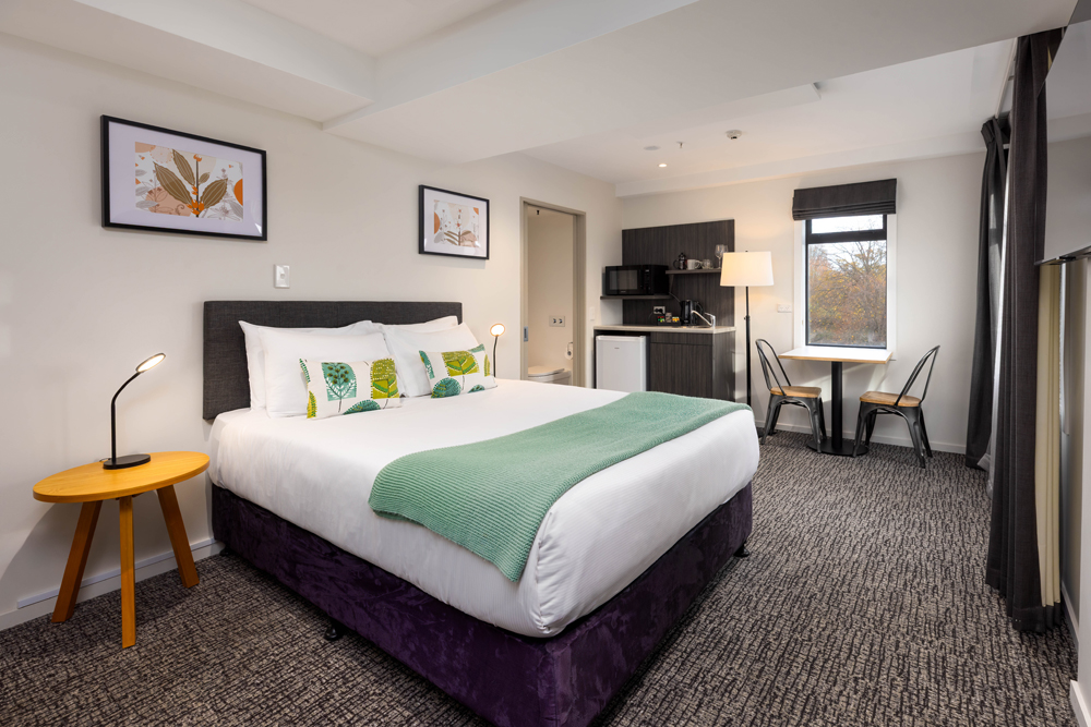 Our executive studio has one queen bed, ensuite bathroom and toiletries.